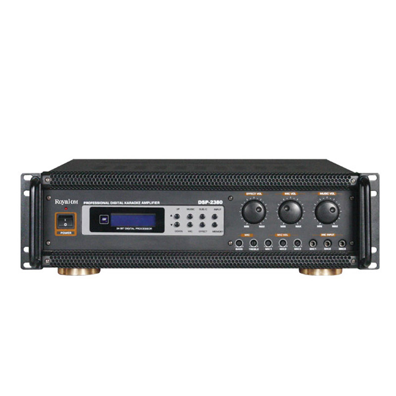 DSP-2380/DSP-3380是DSP前级加专业后级的卡拉OK合并机处理器,强大精良的DSP芯片集成了卡拉OK系统所需的音效处理功能,能完整地呈现来自音源和麦克风的所有细节,所有的功能均可手控或通过电脑RS-232接口进行控制,标配的电脑控制界面,方便地管理本地的参数,另提供红外遥控配置程序用来配置遥控码,这样不用标配遥控器,在工程上也可方便地更改现场遥控码,其独立的中置声道为卡拉OK提供了更清澈的人声表现产品特性